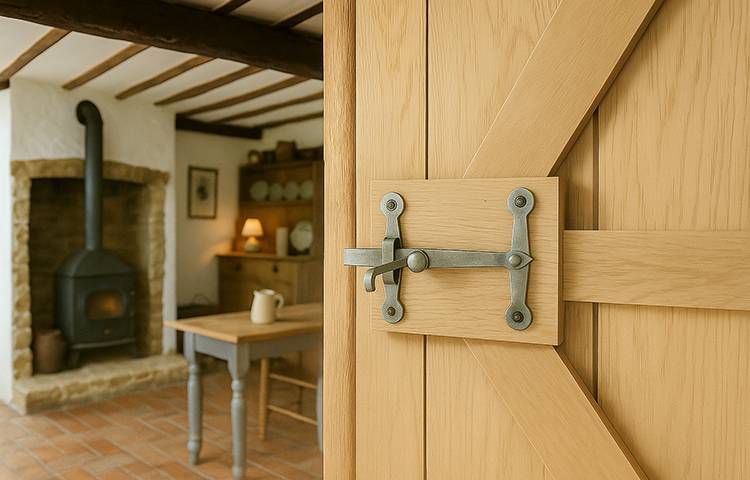 If your room already features hand-forged items such as Suffolk thumb latches, strap hinges, or bolts, match the latch set finish for consistency. The visual continuity of black iron or pewter hardware across doors ties the space together without appearing overly coordinated.