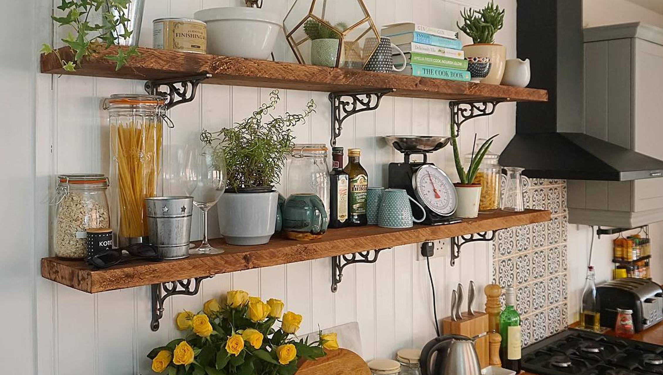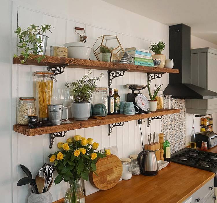 kitchen with decorative bracket shelving