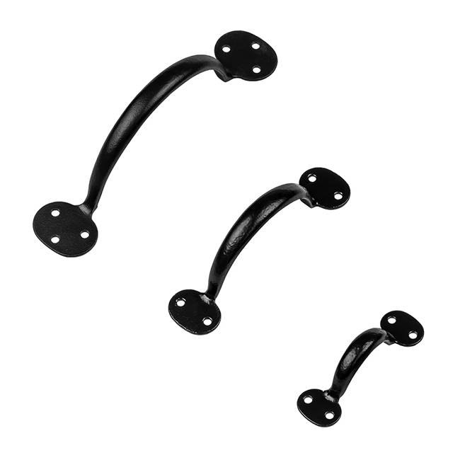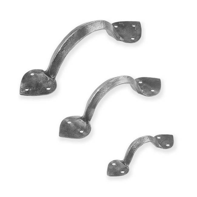 Our traditional hand-forged door pulls come in three sizes — 4-inch, 6-inch, and 8-inch. The 4-inch pull suits drawers or small cupboards and is used with a finger-and-thumb action. The 6-inch, our most popular size, balances well with Gothic or Suffolk latches and allows a comfortable three-finger grip. The 8-inch pull is ideal for larger or double doors, offering a full handhold and a bold, proportional appearance.