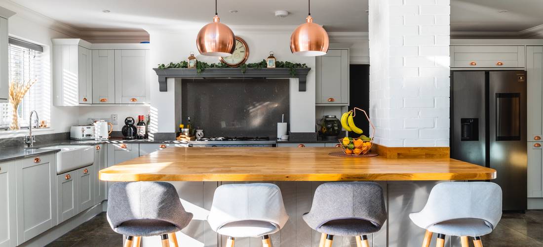 Adam chose a classic shaker kitchen with a granite worktop, and a large central island. The wooden worktop, along with the copper pendant lights and cabinet furniture, provide the perfect accent to the neutral colour scheme.
