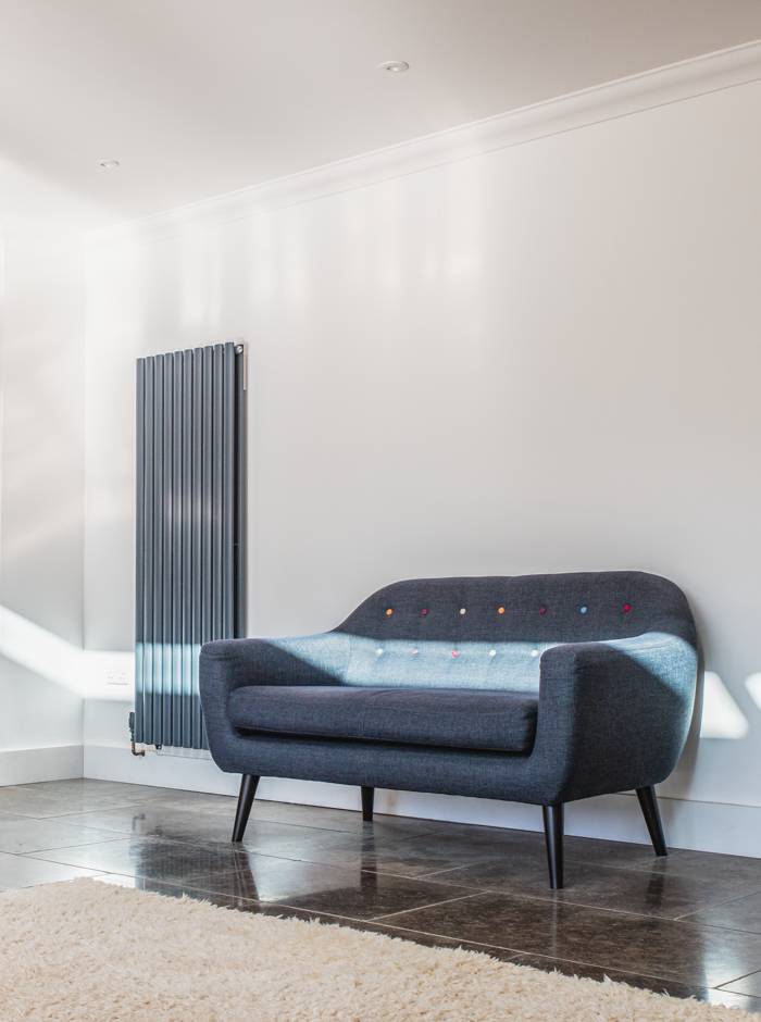 At the other end of the kitchen is a cosy snug area with a sofa and television. It was initially planned as a separate room with a dividing wall, but after much deliberation, Laetitia and Adam decided to bring it into the kitchen. They are delighted with the outcome. The open plan aspect has made the kitchen the perfect social space for the whole family.