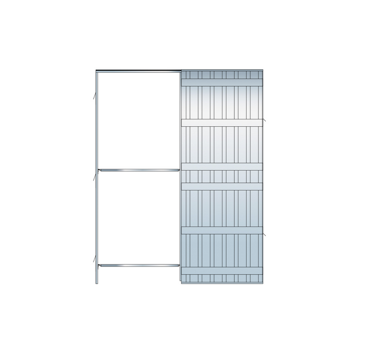 The self-assemble kit is supplied in component form and includes all necessary fixings and detailed installation instructions. There are seven main components to the kit, consisting of the track, bottom frame section, four uprights and a wooden ‘stay’ (which is disposed of once the frame is built). A degree of technical or construction knowledge is required (together with enough clear space to layout and prepare the components) to ensure the system is correctly assembled and fitted. The kit will need to be cut down to suit the size of the opening and accommodate your chosen door size. Clear instructions are provided and common sizes are marked on the wooden stay to assist with cutting and adjustment.