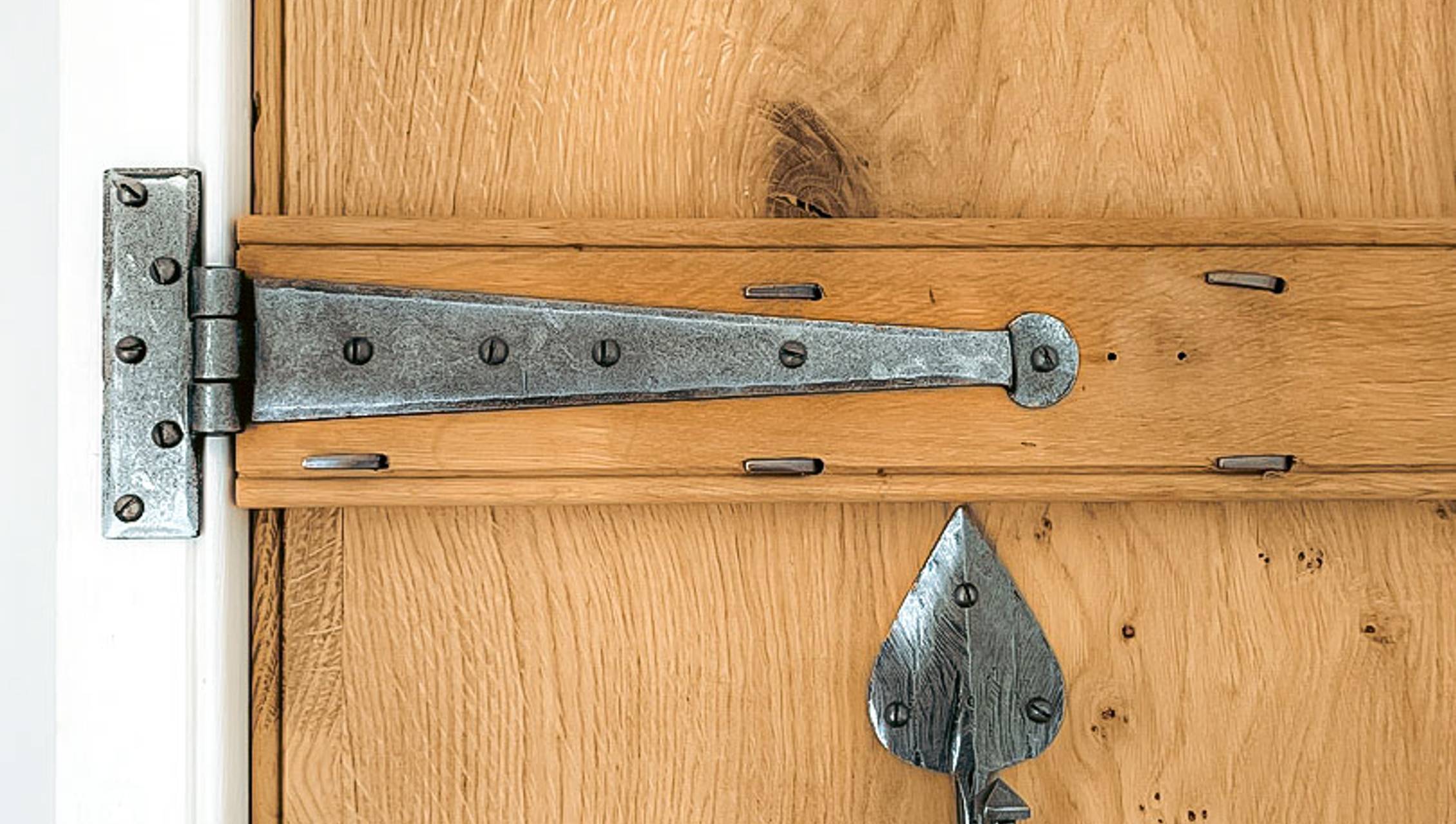 These are hinges with a long strap. The hinge part is fitted onto the stationary frame whilst the strap part is fixed to the moving door. These hinges are traditionally used on ledge and brace doors. Historically, the strap part of the hinge would hold the boards in place. With modern ledge and brace doors, the strap part of the hinge is now a decorative feature rather than a functional one.