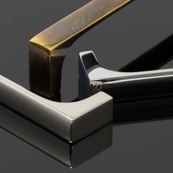 • antique brass geometric pull handle on backplate, modern kitchen pull handle
