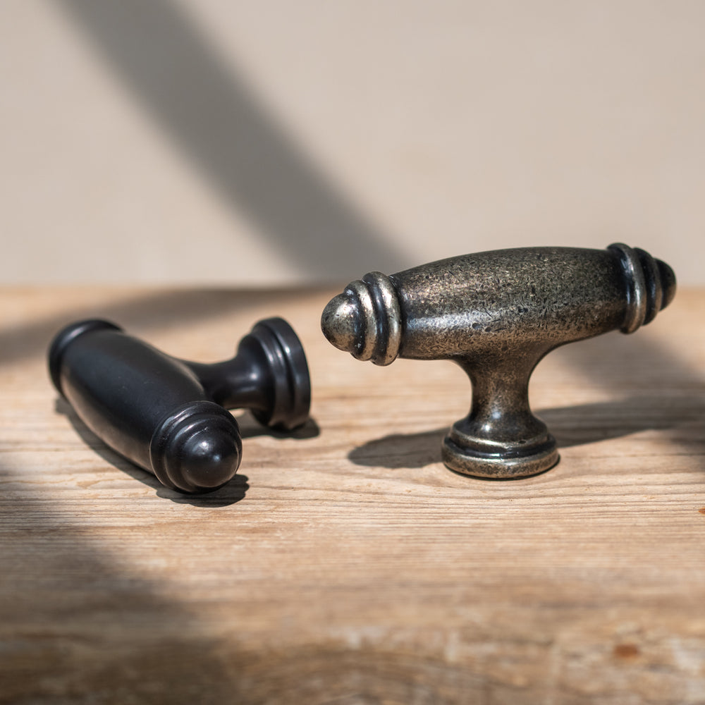The Bronze Artisan T Bar Pull has a traditional barrel-shaped grip with decorative ringed ends, giving it a distinctive handcrafted look. The rounded form feels comfortable between the fingers, while the subtle shaping adds interest without overwhelming the cabinet or drawer front. Its size makes it especially useful on smaller doors or as a paired handle on larger units.
