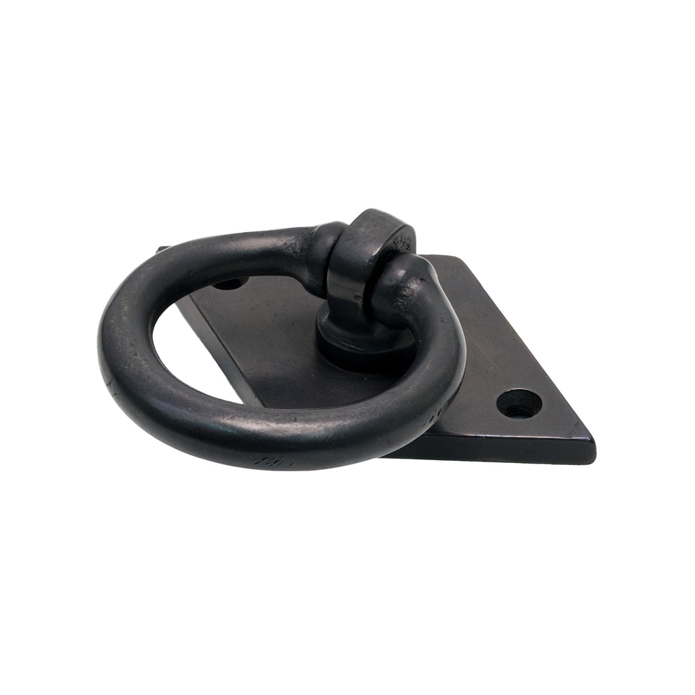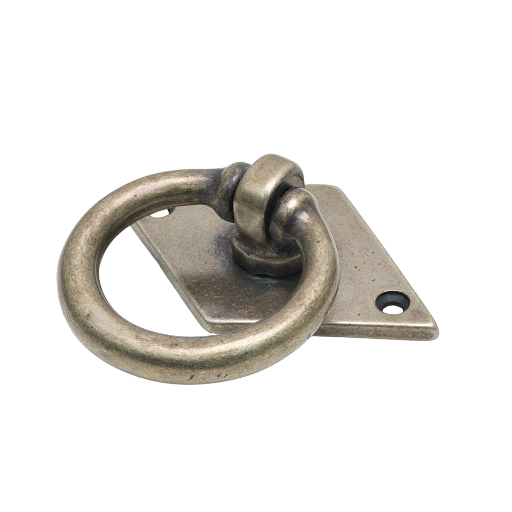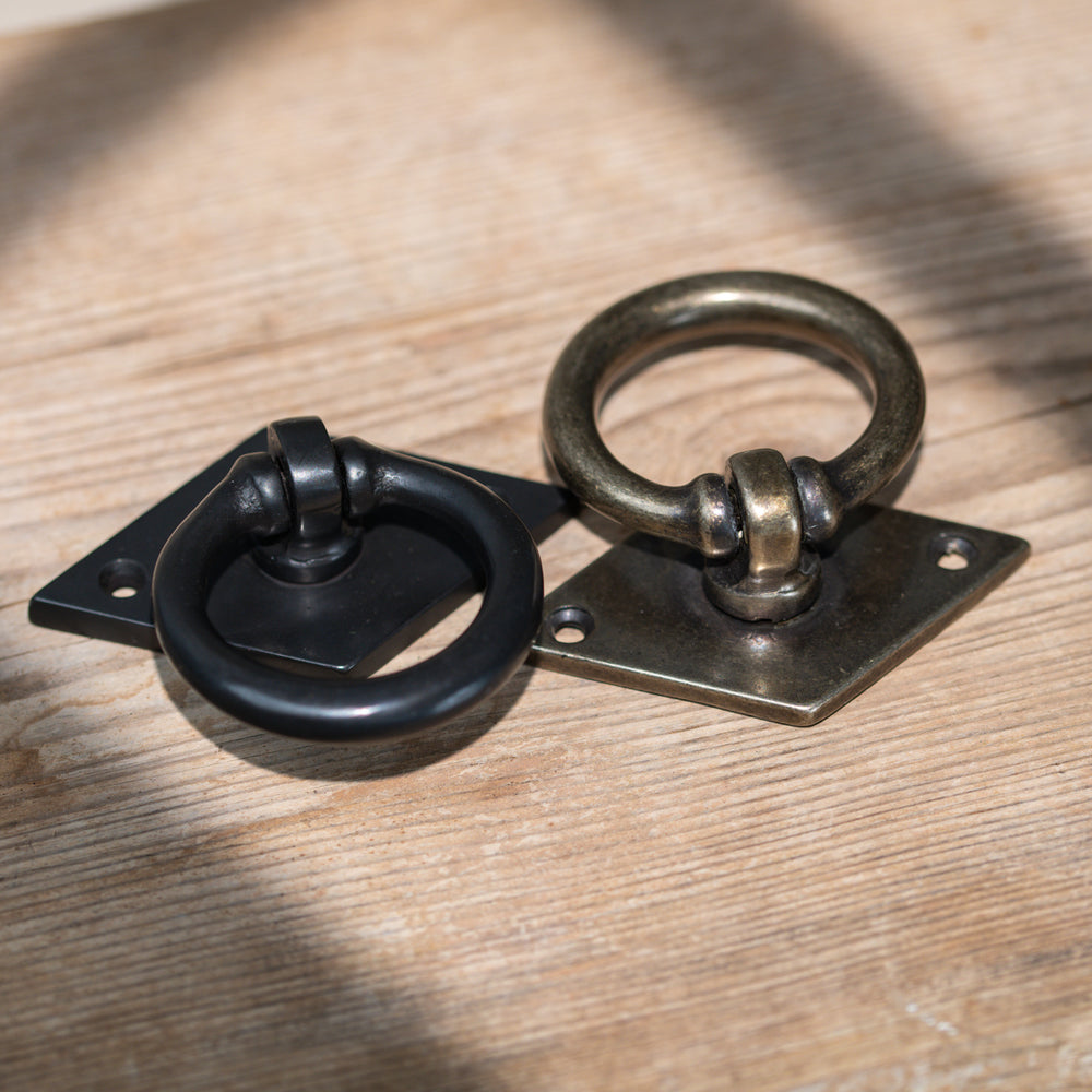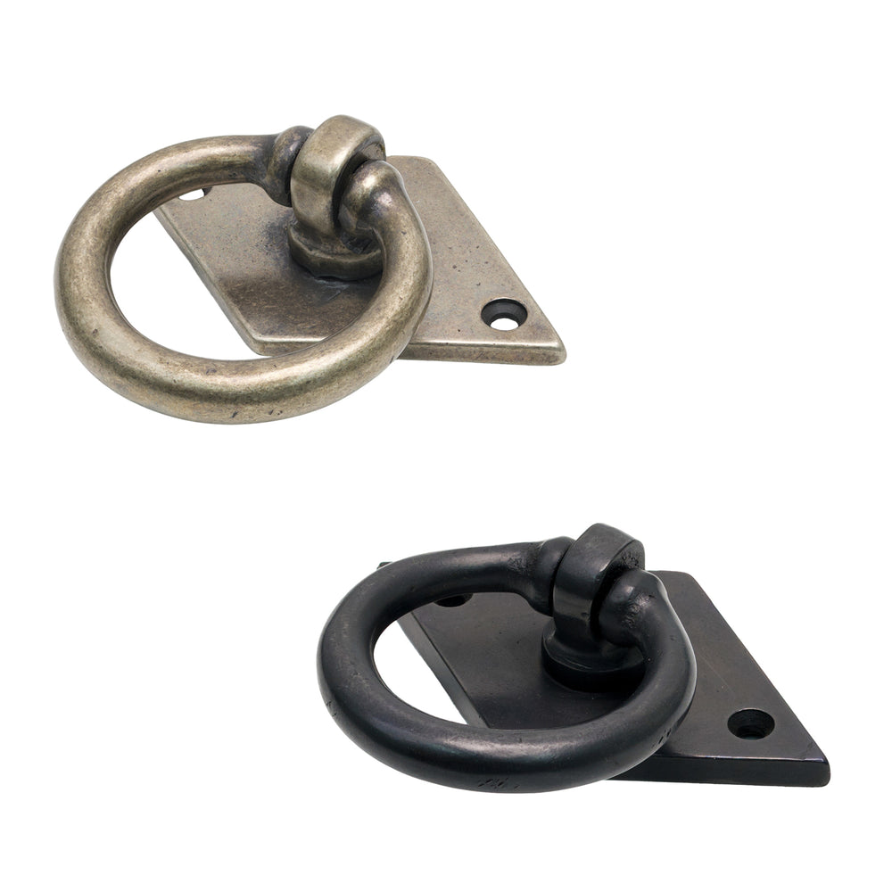 The Bronze Cabinet Ring Pull on Backplate features an open circular ring suspended from a diamond-shaped backplate, creating a simple yet distinctive decorative detail. The ring pivots smoothly from its central fixing point, giving it the familiar movement expected from a traditional ring pull. The geometric contrast between the angled backplate and rounded ring makes this handle well suited to cabinet doors, small cupboards and furniture where a more characterful accent is desired.