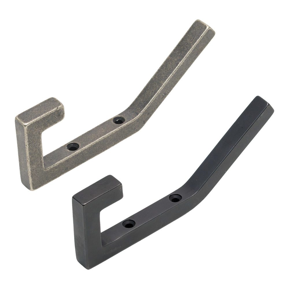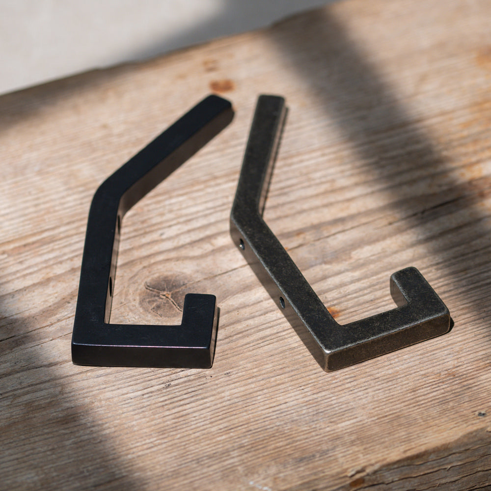 The Bronze Double Coat Hook offers a clean, modern take on a traditional twin-hook design. Cast from a solid 10mm square-section bar, the hook has a crisp geometric profile with two outward-facing arms that provide reliable support for coats, bags or towels. Its slim silhouette makes it especially effective when mounted on a natural wood coat rack or fitted to the back of a bedroom or dressing room door where space is limited.