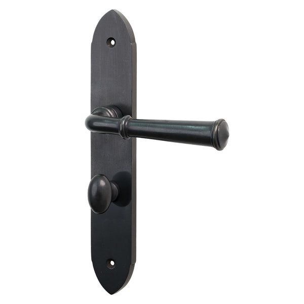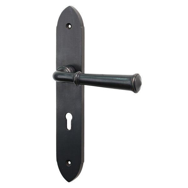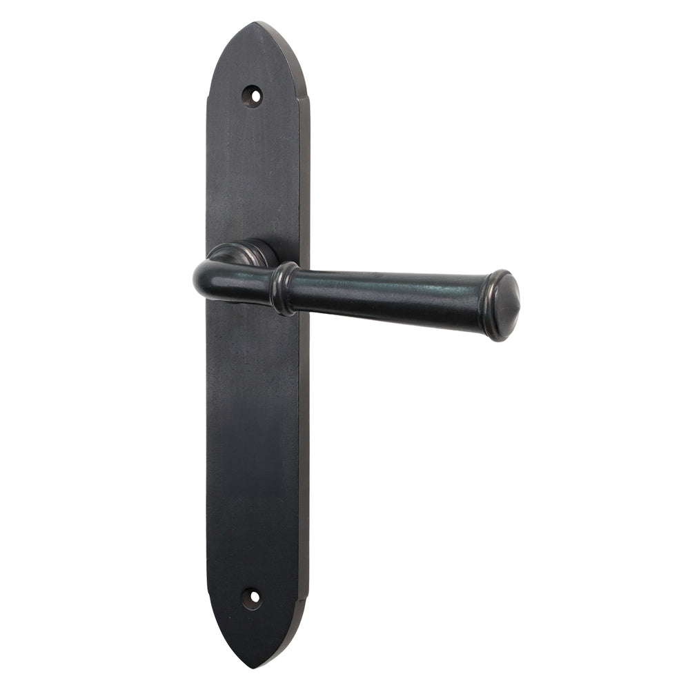 The Bronze Hadley Door Handle on Backplate has a distinctive Gothic influence, with the top and bottom edges of the backplate forming soft pointed arches. The lever itself is round at the neck and widens gently towards the end, creating a smooth sweeping shape that feels secure and balanced in the hand. Raised detailing at the base of the lever and near the handle end adds subtle character without overwhelming the overall look, giving the handle a traditional yet refined presence on the door.
