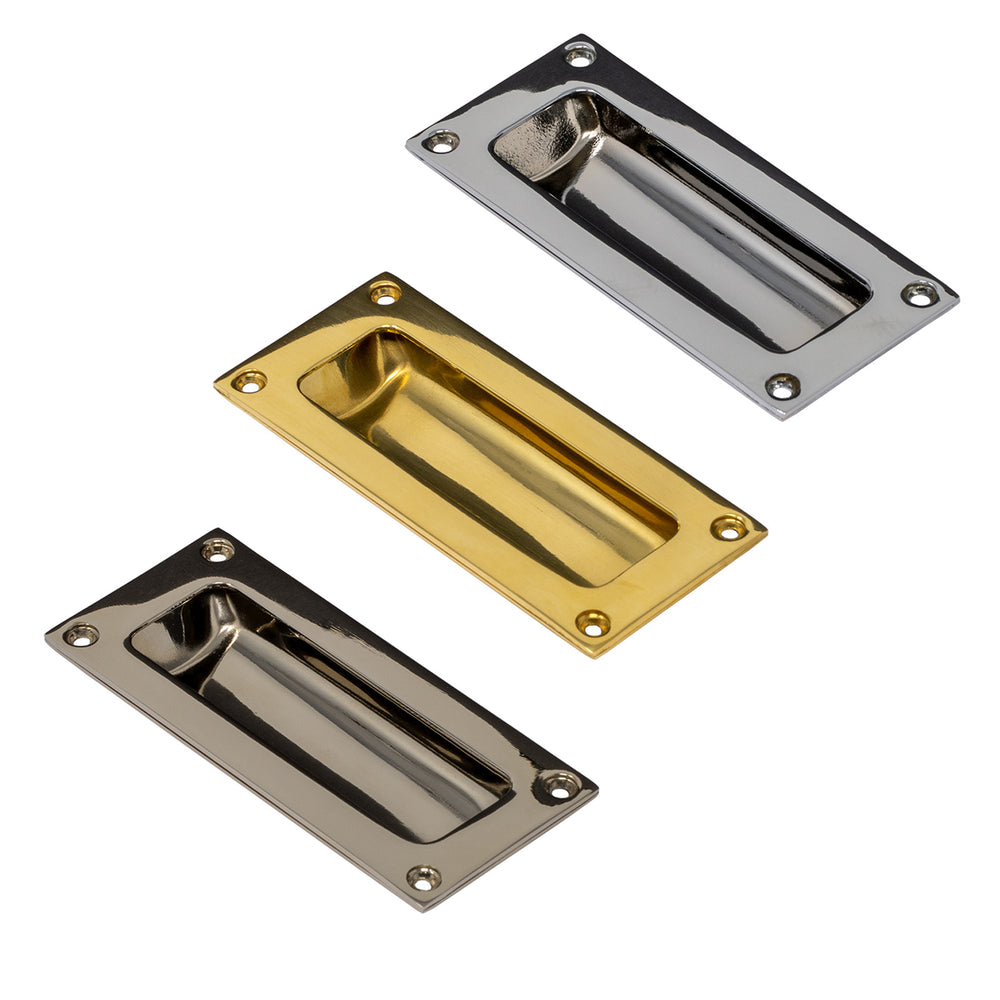 Flush pull handles are designed to be recessed into a bypass sliding door and can also be used on drawers and cupboards. These sliding door handles are made from solid brass and available in polished brass, antique brass, polished nickel and polished chrome finishes. Co-ordinate with a matching Door Plate.